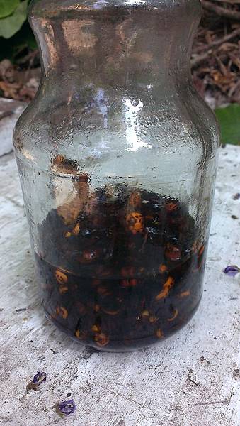 僅見阿伯從車上拿出一罐透明玻璃瓶,走近一看,哇嗚~是虎頭蜂酒欸!