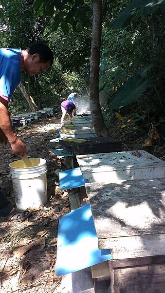 老媽和阿伯則在後面將一盒一盒滿滿的花粉倒進桶子裡。